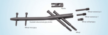 System implantologiczny gwoździa rekonstrukcyjnego krótkiego składa się z jednego z typów lub rozmiarów gwoździa rekonstrukcyjnego krótkiego, jednego lub dwóch wkrętów, które wprowadza się do szyjki kości udowej.